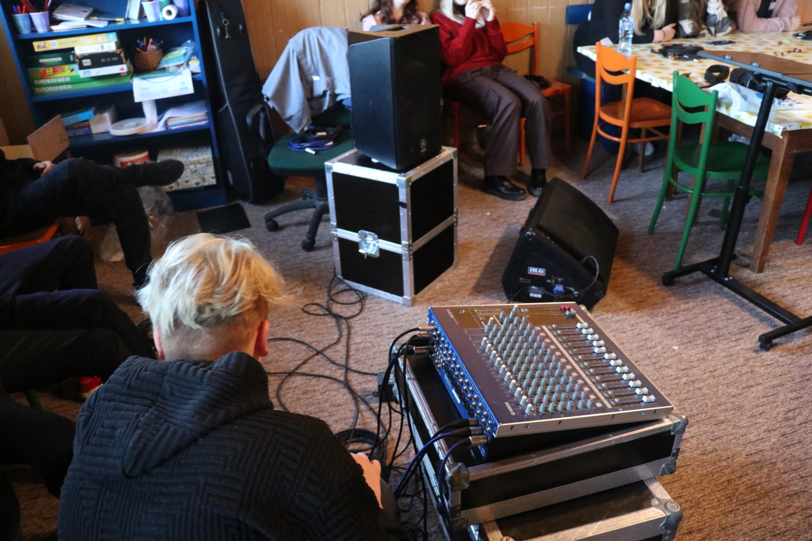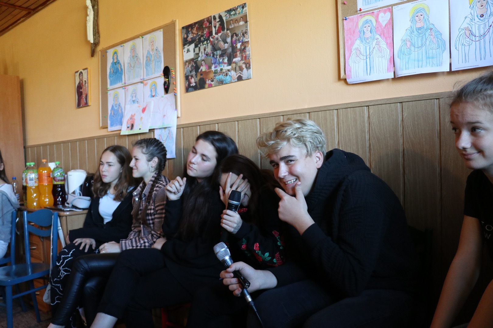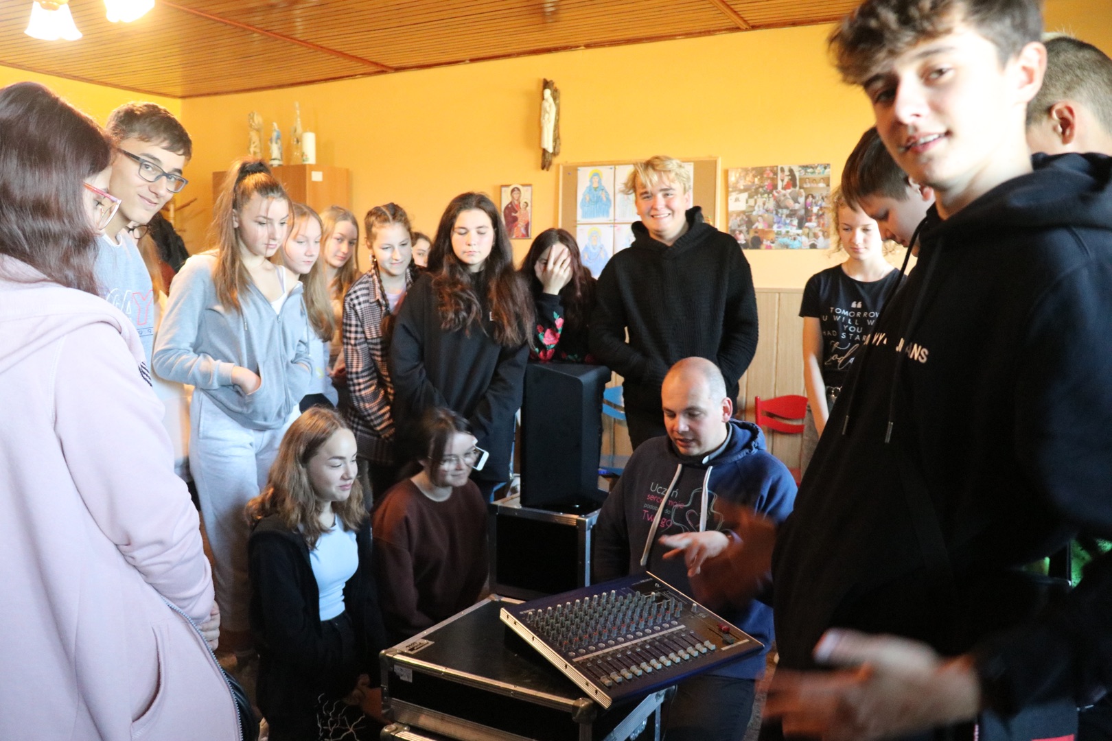 Rozpoczęło się niewinnie - jutrznią, następnie omówieniem budowy i specyfiki psalmów. Z teorii młodzież przeszła do praktyki i dzielnie stawiła czoła każdego rodzaju kablom, poznała ich budowę i metody zwijania w taki sposób, by nie naderwać delikatnych włókien znajdujących się w środku. Z pozoru prosta czynność okazała się nie małym wyzwaniem. W następnej kolejności wraz z Księdzem prowadzącym rozpracowywali mikser muzyczny. Czerpali z tego wiele radości, ponieważ do akcji wkroczyły mikrofony i oczywiście nieszczęsne kabelki. Podczas zabawy z mikserem poznali funkcje i zastosowania poszczególnych suwaków, przycisków oraz wejść. Kolejną rzeczą z jaką się zapoznali były informacje dotyczące prowadzenia scholi. Po krótkiej prezentacji młodzież zaczęła pracę w grupach, nad wcześniej uzyskanymi wiadomościami na, których podstawie musieli dobrać zestaw pieśni na przykładową Mszę Niedzielną. Po tych czynnościach zabrali się za układ oddechowy i aparat mowy. Dowiedzieli się co nieco o związku tych układów ze śpiewaniem, o trzech rejestrach i technikach śpiewania. Następnie po raz kolejny próbowali sprawdzić się w praktyce. Zaczęła się walka z samym sobą, oddychaniem i przeróżnymi ćwiczeniami na rozśpiewkę itp...